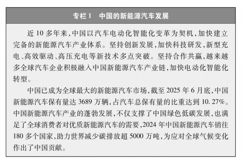 实施大规模设备更新和消费品以旧换新。中国实施大规模设备更新和消费品以旧换新行动,大力促进先进设备生产应用,推动先进产能比重持续提升,推动高质量耐用消费品更多进入居民生活。这既是经济政策,更是着眼长远促进绿色转型的气候政策。2025年1-8月,消费者在汽车、家电以旧换新活动中,购买的新能源汽车占比超过60%,1级能效家电销售额占比达92%;全国新增智能化社区回收设施9000余个。2024年和2025年“两新”政策预计形成节能量超过6900万吨标准煤,减少碳排放超过1.7亿吨。