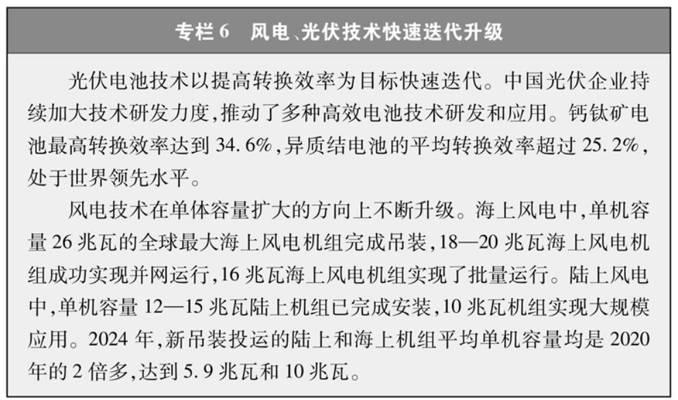推动风电、光伏发电跨越式发展。中国坚持集中式与分布式并举,加快推进以沙漠、戈壁、荒漠地区为重点的大型风电光伏发电基地建设,推动海上风电规范有序建设,积极推广城镇、农村屋顶光伏,鼓励发展乡村分散式风电。截至2025年8月底,风电、光伏发电装机规模突破16.9亿千瓦,达到2020年的3倍以上,贡献了2020年以来约80%的新增电力装机,风光发电量占比以年均提高2.2个百分点的速度稳步攀上新台阶。